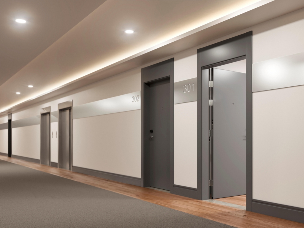 As dobradiças de alta resistência asseguram funcionamento estável, suave e duradouro, mesmo em condições de uso intenso. Além disso, o batente é equipado com fitas intumescentes de última geração, que entram em ação automaticamente em situações de emergência: quando expostas ao calor extremo, expandem rapidamente, vedando totalmente as frestas ao redor da porta. Esse processo impede a passagem de fumaça, fumaça fria e gases tóxicos, que são os principais responsáveis pela redução da visibilidade e intoxicação durante incêndios.